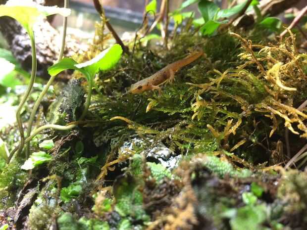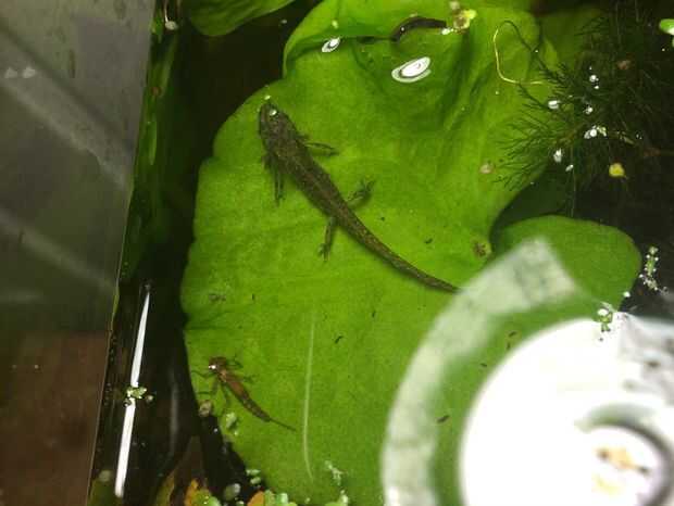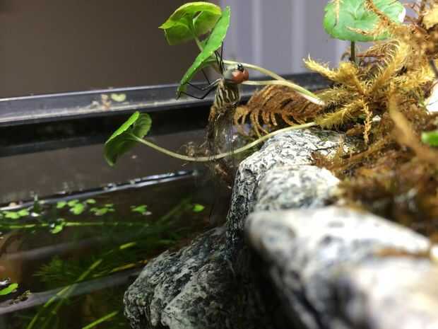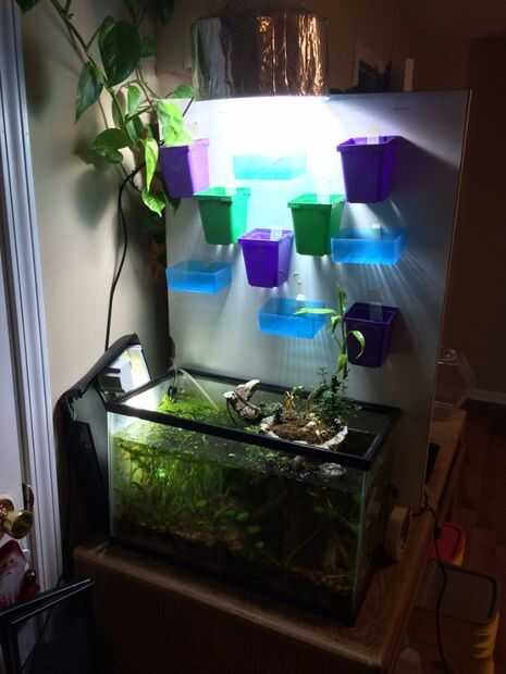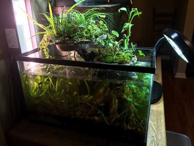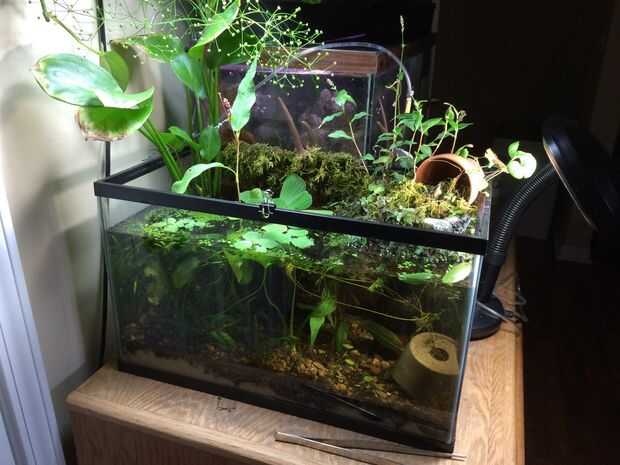 Empecé con un tanque de anfibios e invertebrados acuáticos que cogí en la naturaleza. Les di una isla para que puedan arrastrarse fuera del agua como ellos transformados. Puse las plantas en estas islas y regado con un hilo que viene del filtro de esponja (como una versión menos confiable del puente aéreo que tengo ahora).