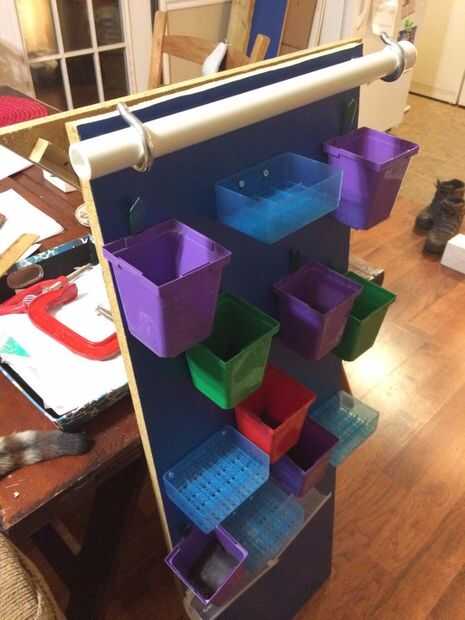Yo utilicé potes que eran rectangulares, por lo que les pude poner plana contra la pared. Yo tenía un montón de macetas pequeñas de plástico cuadrado que algunas hierbas y plantas de tomate fueron vendidas en. Son bonito y colorido pero realmente les elegí porque tienen una tira a cada lado que puede colgar de.