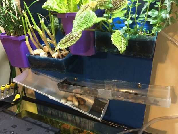 Por debajo de las macetas que hice dos comederos plásticos para recoger tanta agua como sea posible. Ellos son ambos hechos de algún tipo de recipiente cilíndrico (como se puede formar un pringles) corte por la mitad. Yo les atornillan a la pared con las bandejas que se extiende más allá de la pared e inclinadas hacia el centro para dirigir el agua hacia el tanque. Me siliconada la parte superior del borde para hacerlo apretado del agua. Estas bandejas captura la mayoría del agua y evitar que va detrás del tanque, y tienen los musgos y las plantas de semillero. El canal inferior dirige el agua en la parte de plástico que cuelga sobre el agua.