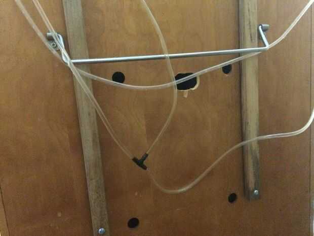 El truco es hacer el tubo de entrada mucho más crees que sea necesario, que se extiende muy por debajo de la parte inferior del tanque. Mina está escondido en un agujero en la parte posterior del gabinete. Este largo tubo constantemente se llena de agua y hace mucho más fácil para el aire a la cabeza de la salida en lugar de empujar contra todos esa presión del agua en la entrada.