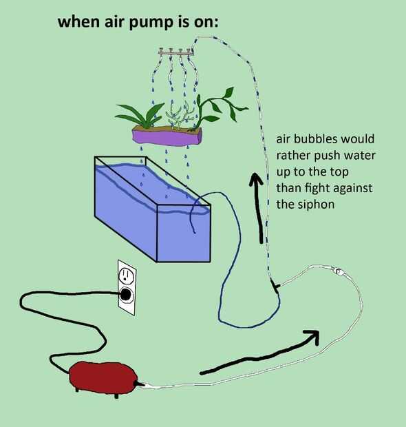 Si se utiliza una bomba de aire o una bomba de agua, puede conectarlo a un temporizador para encenderse y apagarse intermitentemente. Actualmente mi temporizador para encender durante 15 minutos cada hora, pero he estado pensando sobre lo que es menos frecuente. Puede omitir el temporizador y tenerlo en funcionamiento 24/7 pero creo que la planta raíces aprecian brevemente seque un poco (más utiliza más energía).