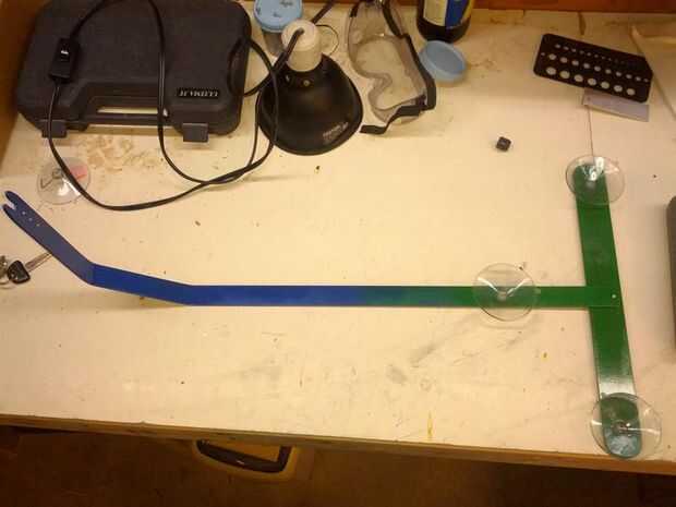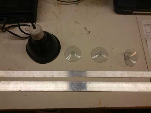 Suerte por encontrar las ventosas perfectas, n cortante excedente de tienda, originalmente tenían algunos ganchos de metal pero se puede quitar fácilmente. Los tamaños del agujero para la barra de aluminio fue elegido para ser pequeño como sea posible pero todavía permitir que los pezones de la taza de la succión caber en, pero no volver.