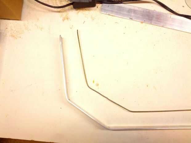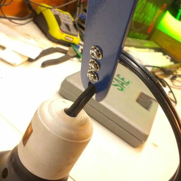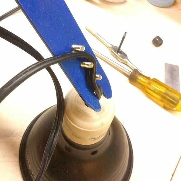 Para empezar, un colgador de ropa fue utilizado para obtener las dimensiones básicas y ángulos averiguados, ya que es fácil de doblar y cambiar para adaptarse al acuario. Las dimensiones fueron utilizadas para cortar y doblar la barra de aluminio de 1". Al final con muescas y presentaron liso para el cable de la lámpara en. Tres orificios fueron marcados, perforados y roscados para los tornillos, que se sujete el cable de la lámpara. La barra de aluminio de 2" fue cortada a la longitud, los extremos redondeados y archivado lisa. Marcado, perforado y archívese los agujeros para las tazas de la succión y el centro para algunos remaches. Arenado y pintado las piezas por separado, con un verde que se descolora azul, le dio una capa transparente de brillo del arco iris (algunas pinturas de marca Krylon, fotos no mostrarlo, pero es bastante limpio) Pop remachados juntos las 2 piezas pintadas y obligado las ventosas en a sus agujeros.