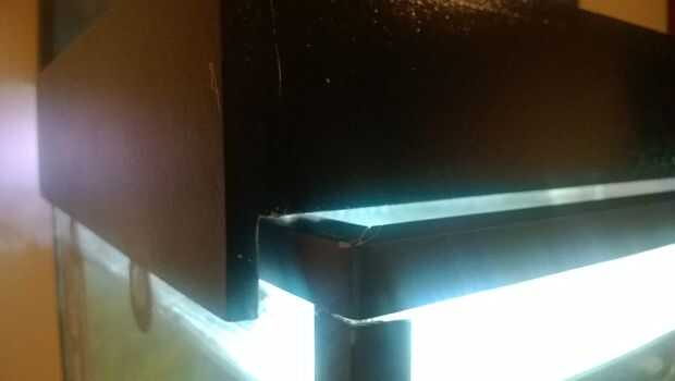 Para la iluminación utilicé MDF para la fabricación de la cubierta. Es compatible con las gafas de lado y no puede caer en el agua, puede deslizar la tapa de adelante hacia atrás a lo que le permite alimentar a los peces. La pinté con muchas capas gruesas para proteger del MDF de la humedad. Usé blanco y negro en el exterior en el interior para reflejar más luz al tanque.