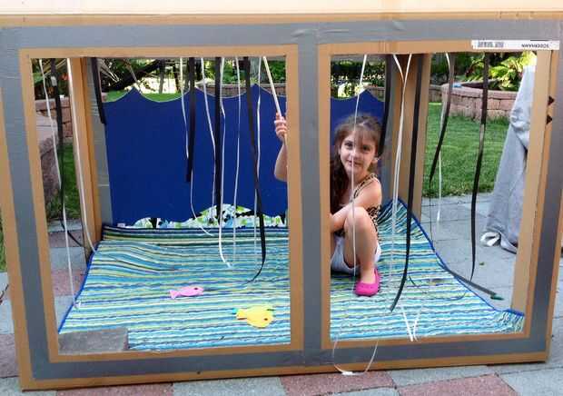 Aquí es mi hija y yo cortando y pintando el acuario de cartón.