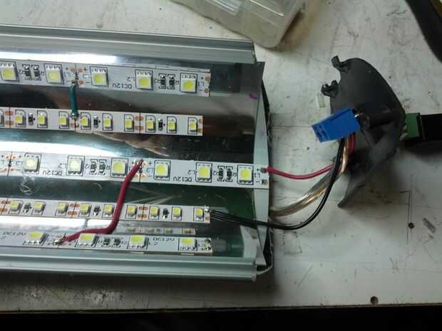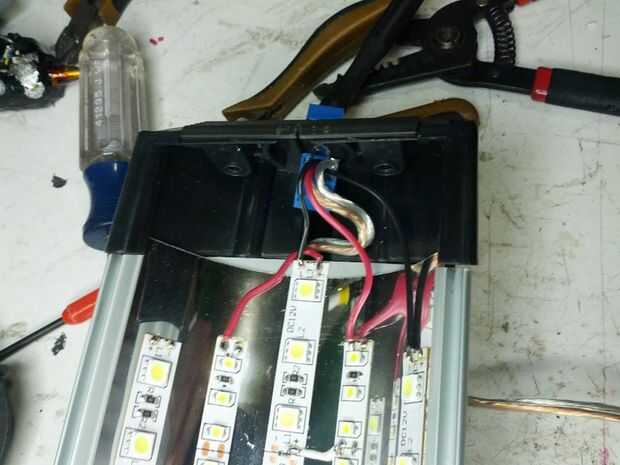 La energía está conectada al dispositivo por medio de dos tornillos abajo terminales soldadas juntas en los extremos con un alambre grueso de doble filamento (utilicé algunos 18AWG cable) utilizado para transferir la energía de un extremo a otro. El poder para las tiras de LED está conectado a lo terminales de rosca, con algunos de lo LED tiras conseguir conexiones cruzadas.