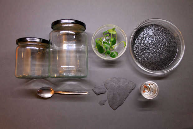 Para la decoración y escapan un paisaje miniatura en su tarro. He utilizado trocitos de pizarra que se corresponde con el color del suelo que utilizan. Usted puede utilizar otras piedras también, pero recomiendo pizarra, rocas de lava o pedernal, que casi don´t reaccionan al agua circundante, don´t uso piedra caliza o arenisca.Por último, agua: