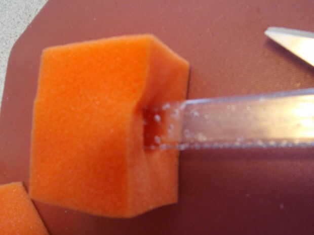 2. corte un agujero en la esponja para encajar el tubo grande en él. No tienes que recorrer todo el camino. a medio camino es suficiente.