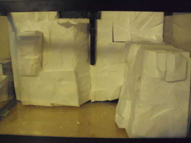 Una vez que tenga un concepto general que puede comenzar por cortar y pegar la mayor parte de su fondo. Usted probablemente tendrá que hacerlo en secciones. Mina se compone de cuatro piezas. La tapa de la nevera a la izquierda crea una gran pared sobresaliente que he añadido unos bloques. El segundo de la izquierda es un pedazo de relleno que se acomoda el brazo del filtro de la energía. La tercera es una pequeña piedra capa doble (arriba a la derecha) que cuñas la cuarta roca grande. El bloque cuarto o el lado derecho es la sección de esquina inferior de la nevera. La gran bomba está escondida dentro de esta roca.