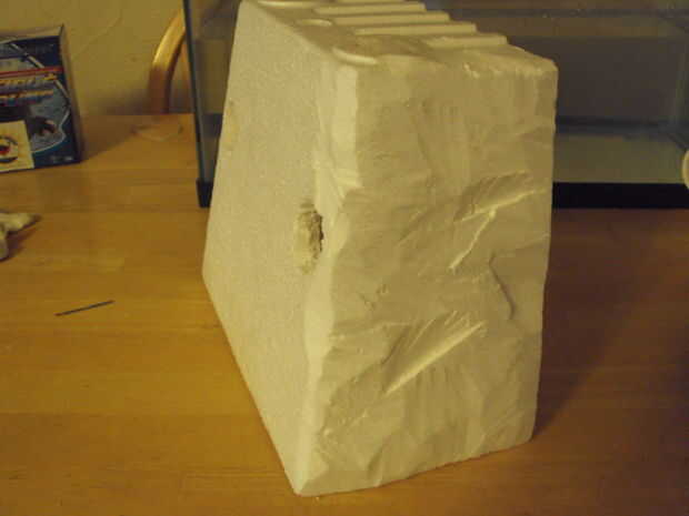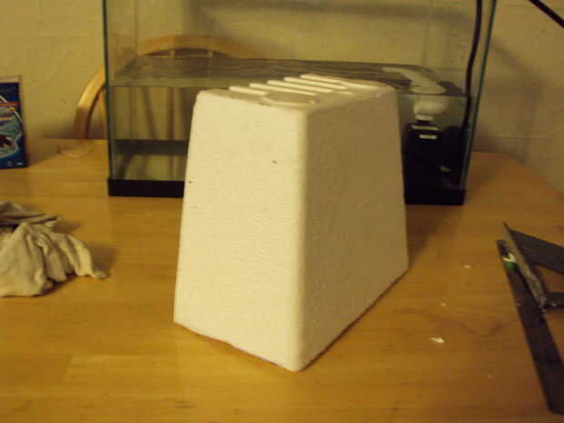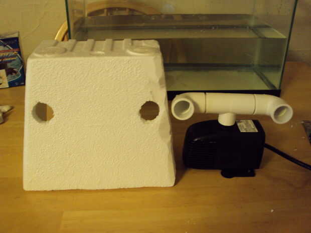 Para mi tanque río elegí dejar de utilizar el diseño de tanque original de río . Simplemente no había espacio suficiente en mi tanque pequeño de 10 galones. Quería ocultar completamente la bomba. Corte la parte inferior del refrigerador para crear una "roca" para albergar la bomba. Cortan dos agujeros para que el manómetro de salida doble.