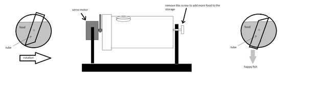 El esquema de alimentador está aquí, su hizo de un frasco de plástico de un forraje y un tubo fijada de pegamento plástico. Sólo cae una parte de la rotación de alimentos en cada 180 grados (o un poco menos) de pescado. La unidad de servo es responsable de esta rotación, hace cada día a las 9:00, 365 días al año. Consigue encender la luz en este momento, se apaga la bomba de aire. En pocos minutos enciende la bomba y mantiene lámpara y bomba encendida hasta las 21:00 El tornillo en la parte posterior del almacenaje del me permite rellenar el almacenamiento de información principal cuando sea necesario.