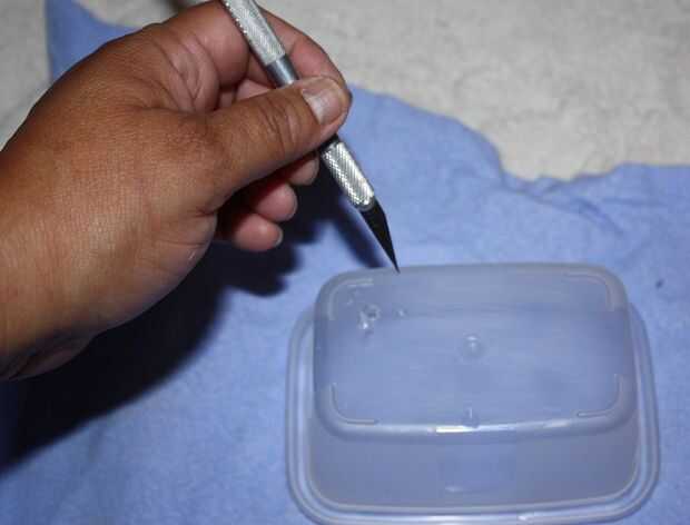Use un cuchillo hobby para perforar pequeños agujeros en la parte inferior (pronto a ser top) del contenedor. Para ello, introduzca la punta de la hoja de plástico, luego gire la cuchilla varias veces. Cuanto más gira, el más grande el agujero. Usted tendrá varios agujeros para mantener el foco de luz de sobrecalentamiento. Por lo menos 6 agujeros de 3/16" deberían ser suficientes.
