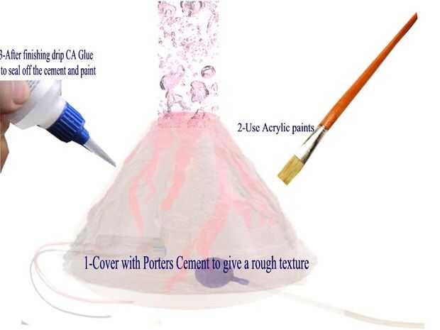 Este paso debe hacerse con mucho cuidado y en un área bien ventilada . Tomar un rojo del LED y poner dentro de una tapa de bolígrafo. Los cables de conexión para el led deben ser aislado y el tiempo suficiente para salir del acuario sin tirar en el volcán. Sellar la parte inferior de la tapa con silicona de acuario o pegamento caliente. Pegamento de drible CA en todos los lados del volcán. Deje que se seque completamente por la mitad una hora después de que se haya secado por sumergirlo en un recipiente pequeño (no el acuario) durante al menos 24 horas. Esto es para filtrar cualquier químicos que pueden envenenar a los peces. Asegúrese de cambiar el agua cada pocas horas.