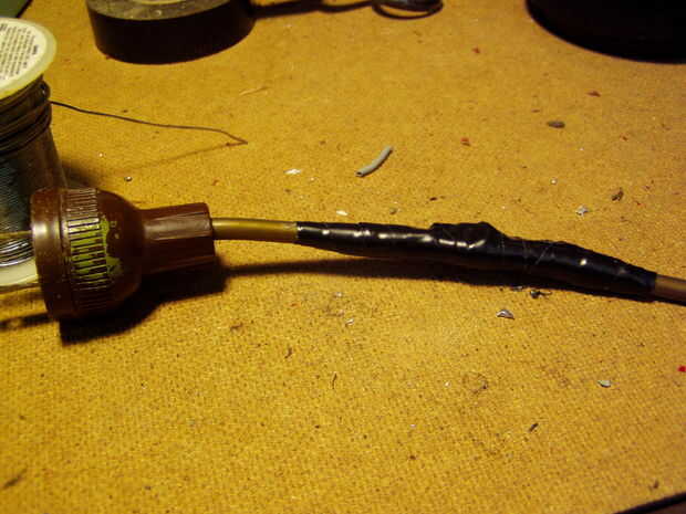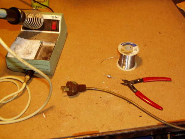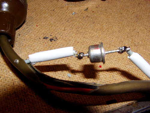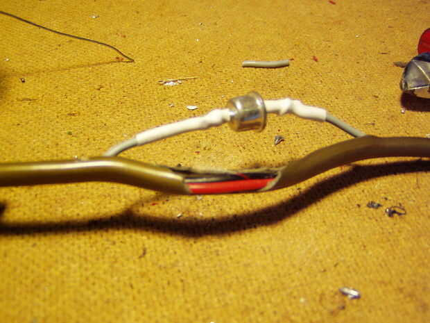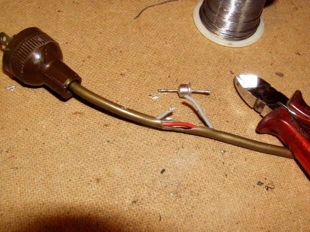 5. soldadura diodo (polaridad no es importante, pero leer explicación para equilibrar la carga) entre los dos expuestos los alambres de cobre y aislar con tubo retráctil