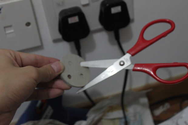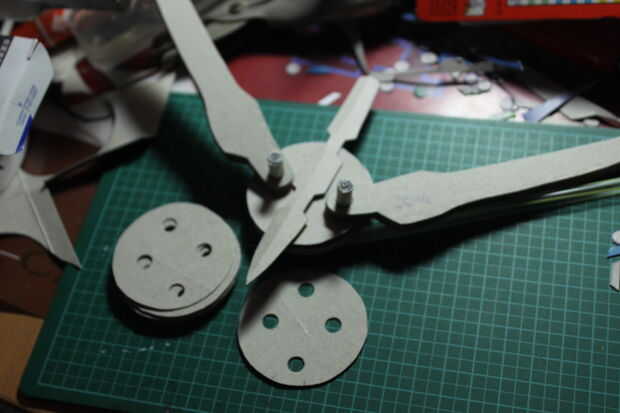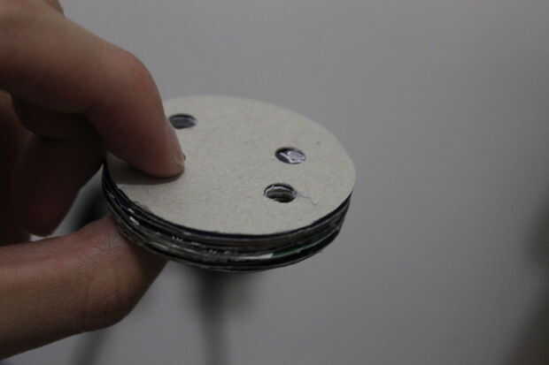 Corte 1 disco circular y perfore 2 orificios, cuidar la distancia entre agujeros es suficientemente amplia como para 1 flecha pasar a través de libremente incluso después de instalación las 2 extremidades.