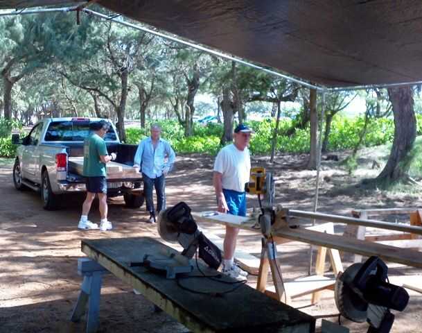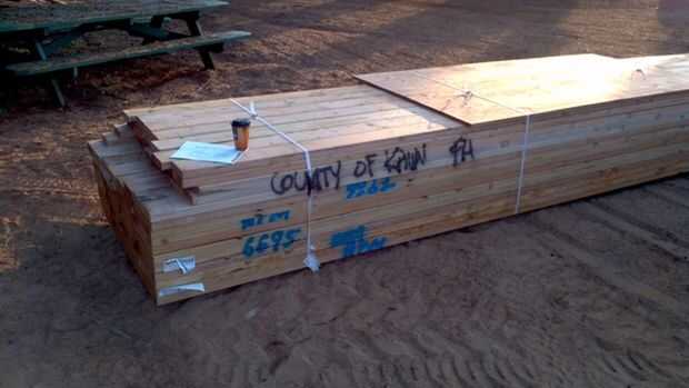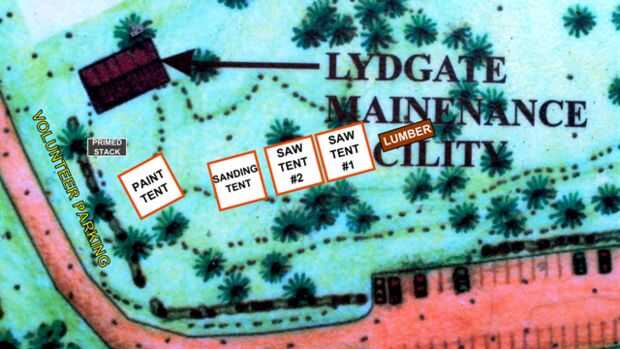 La madera de construcción para una gran construcción será carro entregado antes del día de preparación. Elegir un lugar de buena entrega y especificar la orientación de las juntas. Escoge un lugar seguro. Visualizar la configuración del sitio de trabajo prep, idealmente organizada con caminar mínimo y girando mientras transporta madera, corte, lijado, cebado y apilamiento a seco (ver ejemplo de mapa FKLP).