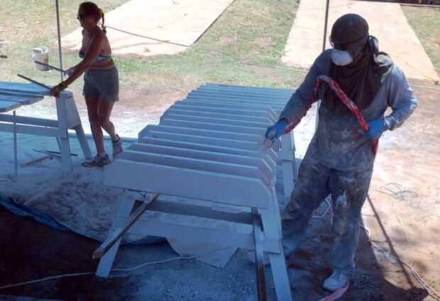 FKLP había cebada todas las piezas con una imprimación a base de agua. Partes fueron apiladas en postes que lleva mucho tiempo preparadas, volteadas y pintadas en los lados restantes. Después de un corto período de secado, dos voluntarios de apilan piezas para curar. Espaciadores de madera fueron insertados entre todas las capas.