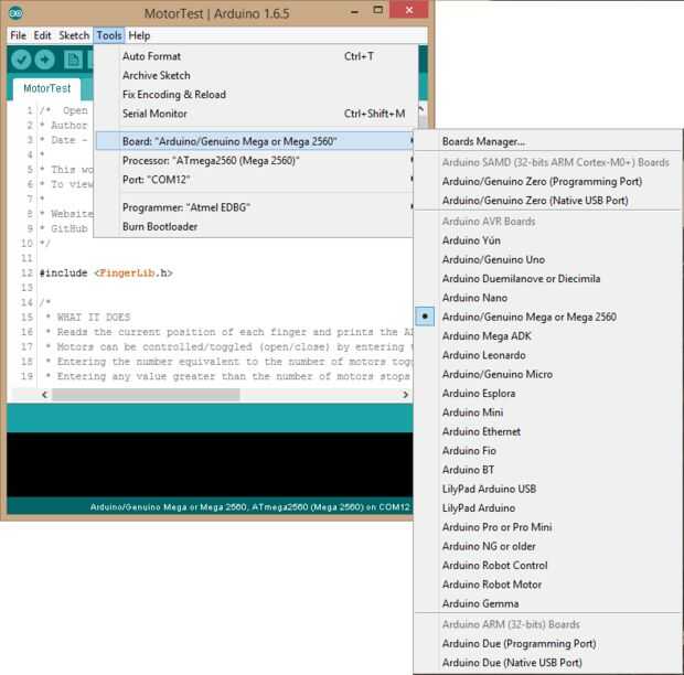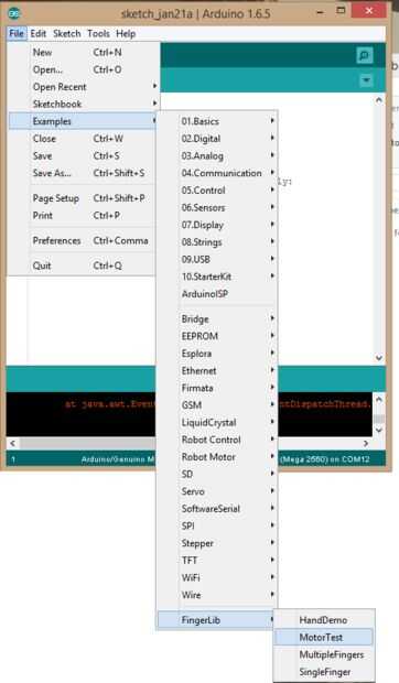 Una vez que se ha instalado la biblioteca FingerLib, abra Arduino y abra el ejemplo de 'MotorTest'.