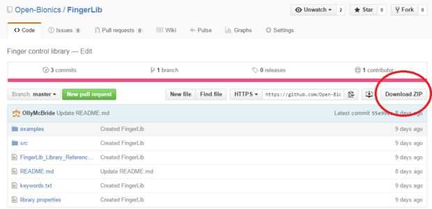 Una vez instalado Arduino, tenemos que descargar FingerLib.h, una biblioteca personalizada escrita por biónica abierto para manejar el control del motor y otras tareas específicas de la Junta. FingerLib.h incluye varios dibujos de ejemplo para las funciones de control de dedo simple y también es utilizado por el firmware de la alcachofa para el sistema de control de la mano completa.