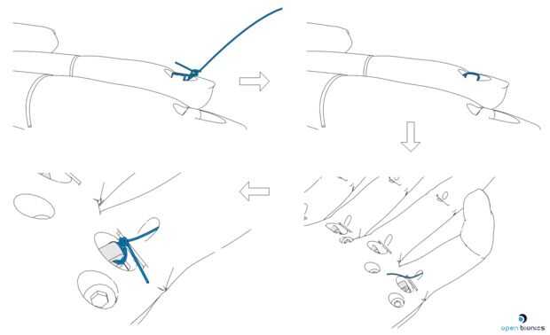 - Un nudo en la cadena del tendón para garantizar que el punto de fijación del tendón en la punta del dedo, recomienda el uso de múltiples nudos y tire firmemente para mantener segura