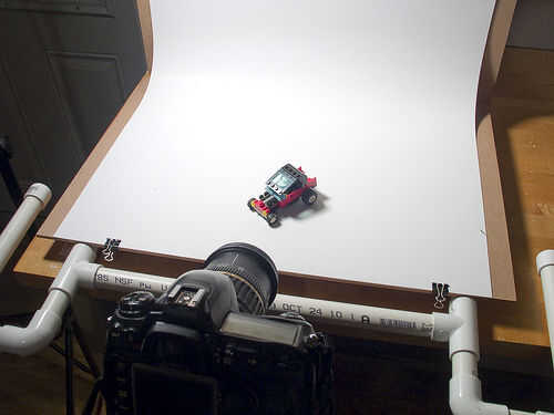 Antes de configurar las luces, usted debe colocar a su tema en el centro de la escena. Si usas el cyc, desea colocar sobre 4-6" atrás del borde delantero y centrada de izquierda a derecha. Ayuda si el proyecto puede estar parado en su el propios. Si no, puede usar adhesivo puddy (diversión Tak), para ayudar a sostener hasta el ángulo que quieras. Tenga en cuenta que desde este momento, se refiere a la colocación de luces y reflectores como en posición alrededor de un reloj, con el tema en el centro.