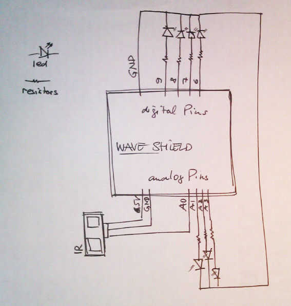 conectar tu LED y sensor de infrarrojos para el protector de la onda según esquema (Nota: por favor, instale todo de acuerdo a esquema y no he anunciar de aquí a los leds de pines ya utilizados por el waveshield como veis en la imagen siguiente)