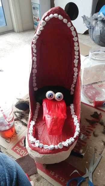 he comprado esta peluca rizada de Amazon y adjunta a la parte posterior de la máscara. También caliente pegué el nylon negro dentro de la boca y proporcionar una manera para ver hacia fuera sin ver pulg. con pegamento caliente, os adjunto los 2 globos oculares (ver mi otro instructivo sobre cómo hacer ojos realista!) encima de la lengua.