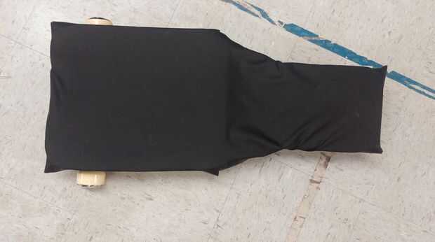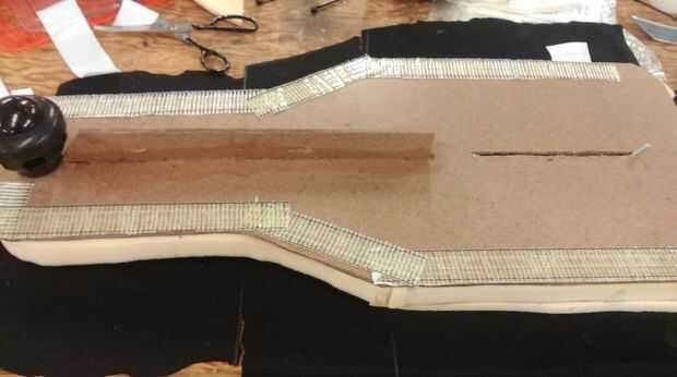 6. Coloque a la tela poliuretano laminada en la parte superior de la placa principal y envuelva el exceso alrededor de los lados de la espuma, fijar los extremos del exceso a la cinta de la alfombra.