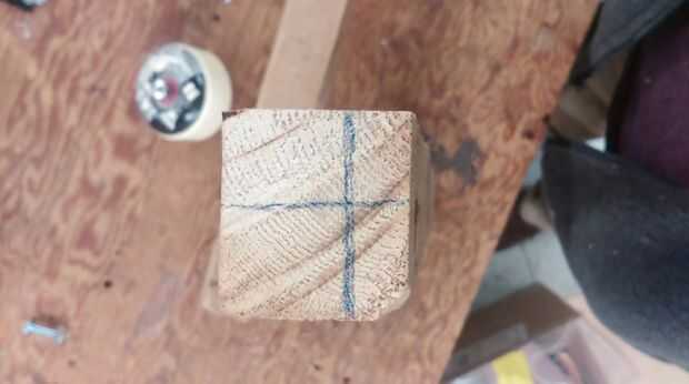 2. En los extremos de 12" x1½"x1½"bloque de madera, hacer una línea horizontal ½" encima de la parte inferior de la madera y una línea vertical ¾" de un lado de la madera. Repita en el otro extremo de tal manera que los orificios se alineen.
