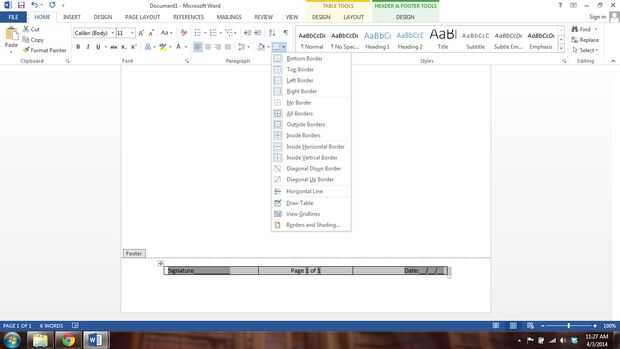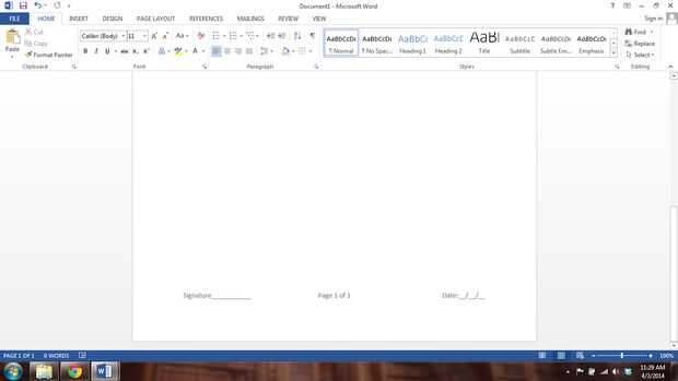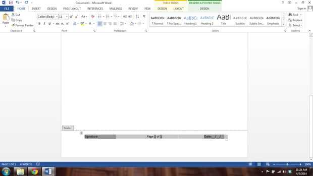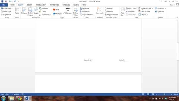 Ahora para comprobar que todo está funcionando, sólo agotado unas frases del texto y añadir un salto de página. En la parte inferior de la primera página ahora debería tener Página 1 de 2 y un área de Initials___. En la última página debe tener: Signature___ página 2 de 2 Fecha: __ / __ / __
