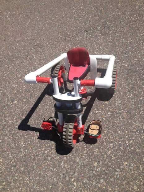 Centrado en la cinta de Velcro en la parte posterior del asiento del triciclo y envuelve Coban(TM) vertical el respaldo para mantener el cinturón de seguridad en su lugar. Después de meses de uso diario, el cinturón de seguridad ha no estándar).