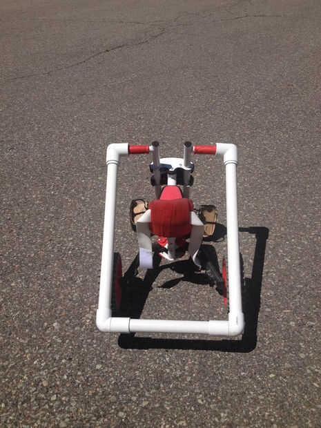 Llegó el triciclo con un asiento de bicicleta plana (ha diseñado para convertir a una bicicleta de equilibrio), así que tomamos dos piso de linóleo azulejos y cortarlas para ser aproximadamente 6 pulgadas alto, lo suficientemente amplia como para abarcar la parte de atrás del asiento del triciclo y redondeadas los bordes superiores.