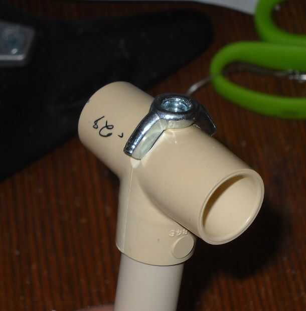 Esencialmente lo mismo que la otra versión de PVC; éste utiliza una tuerca de mariposa en vez de golpear ligeramente el agujero de nosotros mismos.
