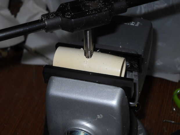 Toque en el agujero (no tengo un pequeño grifo, usé 1/4-20). Esto hace roscas de tornillo en el agujero.
