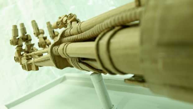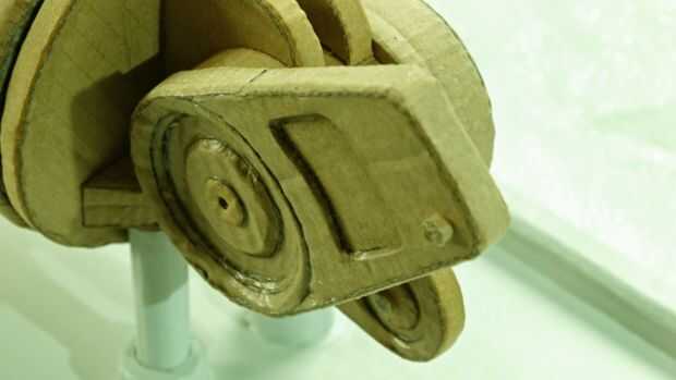 -Los pequeños pistones que se mueven cada dedo eran los más difíciles de construir. Primero traté de cubrir una tira de cartón con papel marrón. Fue a tiempo. Más adelante sólo doblé el papel cada 2mm siempre uno encima del otro para formar un tubo, era plano cuando estaba hecho. Lo que esculpió la cosa a una forma cilíndrica con mis dedos.
