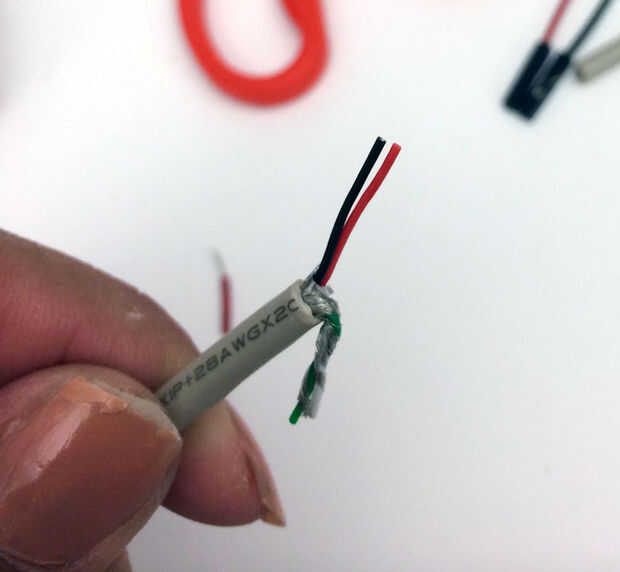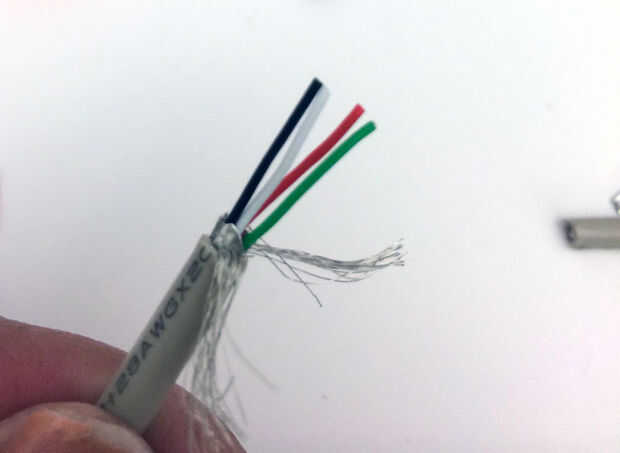 Generalmente, USB tiene 4 cables (a veces hay más dependiendo del tipo), pero usted verá una potencia, en, correrá y tierra así como un montón de material (la materia plata en mi foto) de protección. Encontrar los cables rojo y negro (alimentación y tierra) y el resto de la curva los cables detrás (estará cortando estas apagado más adelante).