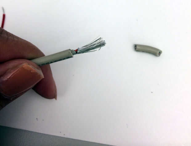 Luego tira una parte de la goma de protección para mostrar el interior del cable USB.