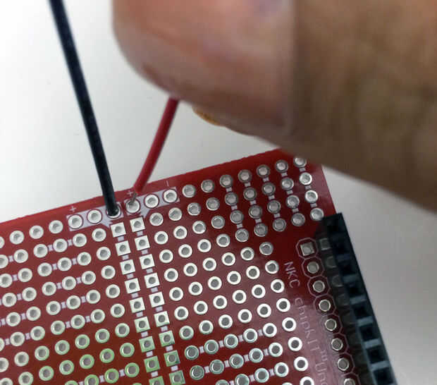 Si te fijas en la parte posterior de la protoshield hay una fila de agujeros con cajas débiles alrededor marcadas con + y - y + y - (Foto 1).