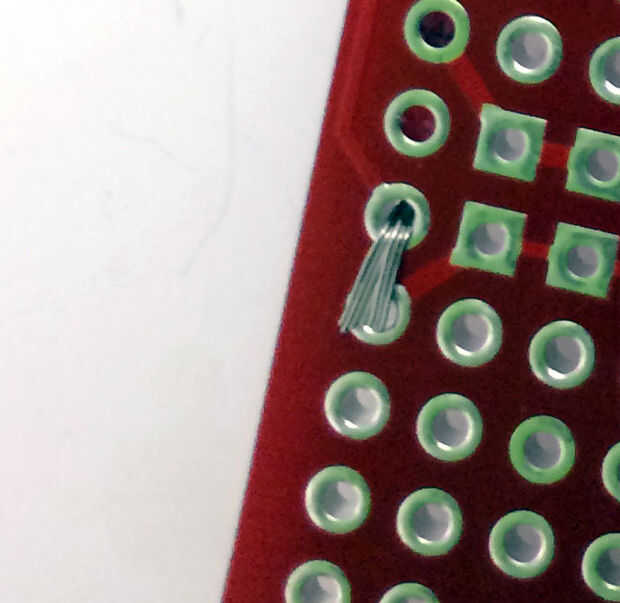 Asegúrese de que suelde bien el cable en ese punto (incluso gotea sobre el orificio siguiente si es necesario (Foto 3).