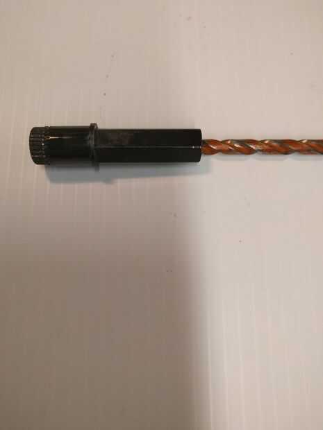 Utilizando el orificio piloto roscado existente como guía, perfore axialmente el eje de salida todo el camino con un 1/4" del pedacito de taladro. Es más fácil hacerlo en un torno, pero se puede también cuidadosamente hacer en una prensa del taladro si no se dispone de un torno.