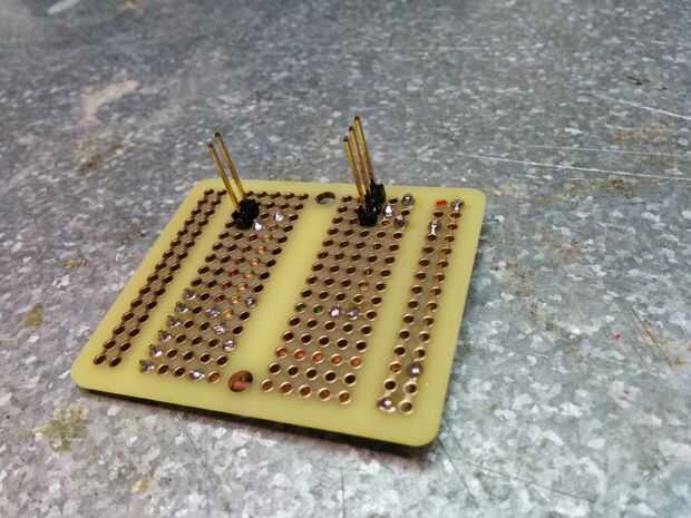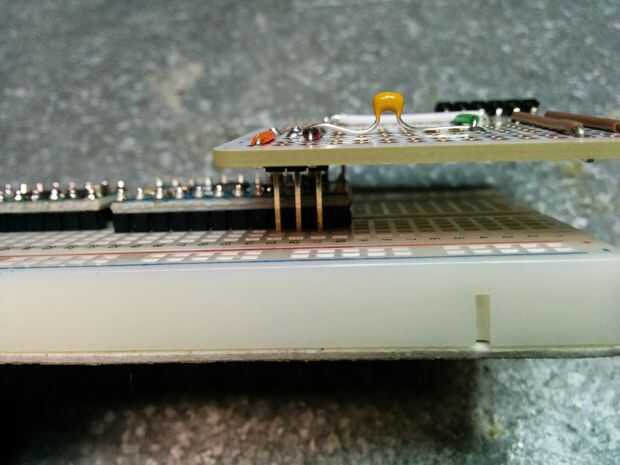 Para borrar el botón de reset que tardó pernos encabezado entonces empujaron a través de los collares de plástico hasta un mínimo de soldadura pegado a través de. Un poco de cuidado debe tenerse para alinear el adaptador en los orificios correctos. Al lado que se muestra allí es uno de los pines de Arduino que se omite, pero por otro lado se alinea con las dos clavijas de derecho-más (en esta imagen).