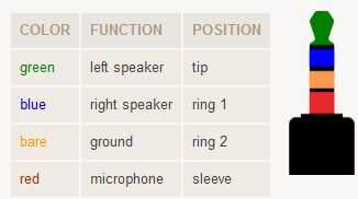 estéreo estándar excepto el manguito inferior se divide en 2, haciendo los 3 primeros contactos el mismo orden que un jack estándar y el sistema de contacto más abajo a un lado de un micrófono.