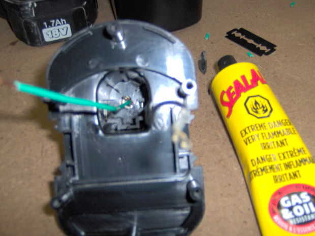Pegamento en la batería parte que encaja en la herramienta de la vivienda. Observe cuidadosamente la polaridad!!! Usar sellos de plástico común-todo pegamento ya que también es resistente al agua y sirve como un buen aislante