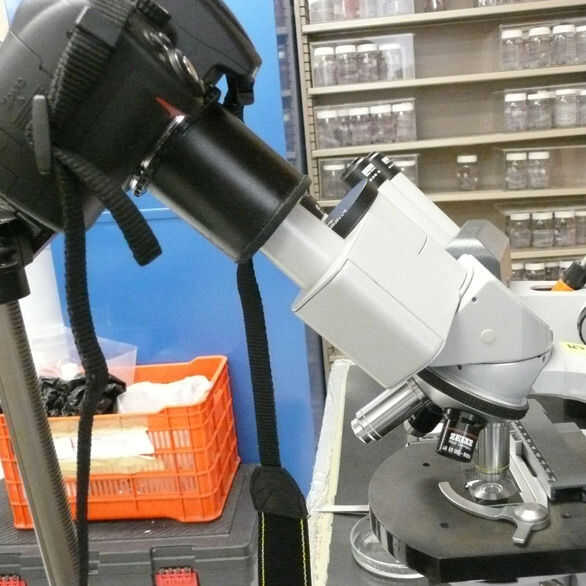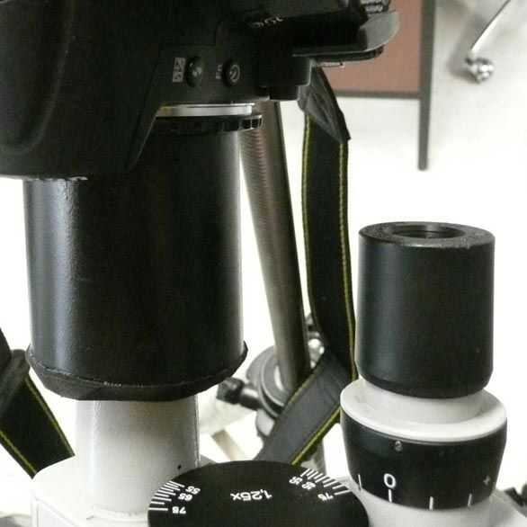 Para ajustar la cámara en la marca de microscopio el ocular ir a través del agujero en la espuma. Puesto que el agujero es ligeramente más pequeño que el ocular debe ser a prueba de luz. Tiempos de exposición se ser largo así que asegúrese de que te usar un trípode.