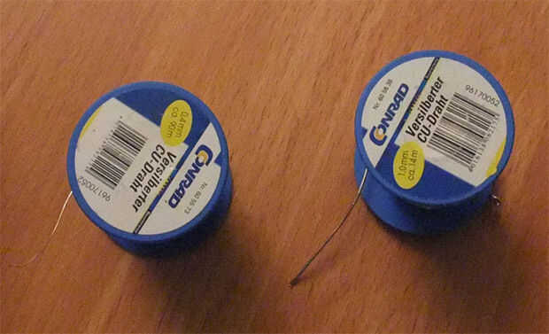 Vea las imágenes de algunas de las partes. Para el botón momentáneo me gusta este tipo, estable y agradable a la prensa. Para el PCB he utilizado el tipo con soldadura de puntos por un lado, lo puede conseguir barato en eBay. Para conectar el conector USB, he soldado el alambre fino, alambre de cobre plateado de 0,4 mm, y para el montaje de la USB he soldado de alambre grueso, alambre de cobre plateado 1 mm, que soldado en los cuatro contactos exteriores del conector USB, que es bastante estable. Para el IC SMD puede conseguir adaptadores baratos de eBay. Así que sin las bobinas de alambre, en suma se puede construir por menos de 20 €.