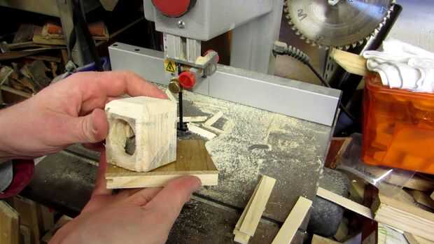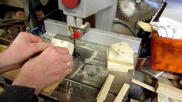 Nuevamente, hay muchas maneras de hacer el chaflanar. Lo hice a mano alzada en la Sierra de cinta (con la pieza descansa sobre la mesa con una de las esquinas), que no es la mejor manera de hacerlo. Usando un bloque en v (un bloque con un corte v con ángulos de 45°) sería una mejor opción, y una sierra de mesa trabajaría demasiado. Por supuesto, también se puede utilizar un plano, archivo o raspador para hacer el trabajo. Sólo asegúrate de que estás cómodo hacerlo - si no, entonces probablemente no es una idea segura para comenzar con.