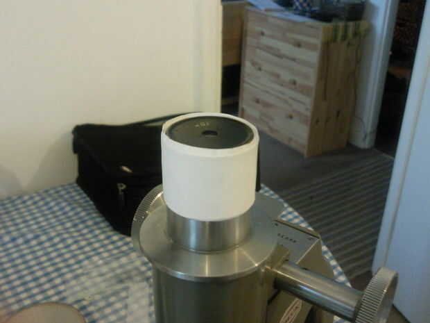 Medir el ancho de la tira de papel para el adaptador (ver foto) y cortar 4 tiras de papel. Les pegan a un extremo como antes y envolver el extremo redondo del barril del ocular una vez. Marca donde el traslapo es y poner la tira. Frotis de una gota de pegamento para madera en la tira.