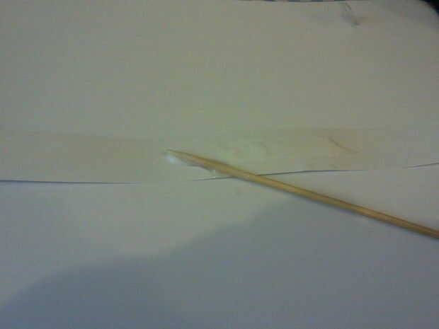 Enrollar la tira alrededor del cañón y el pedacito pegado entrará en contacto con la tira. Viento se ronda el barril untando una gota de woodglue cada par de pulgadas más o menos hasta que el tubo que se está haciendo es aproximadamente de 2mm de espesor.