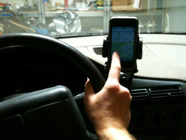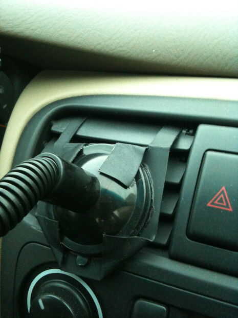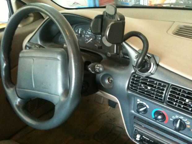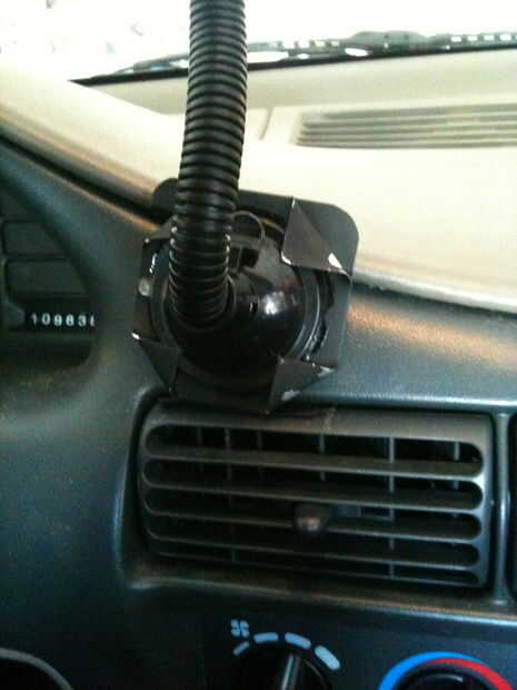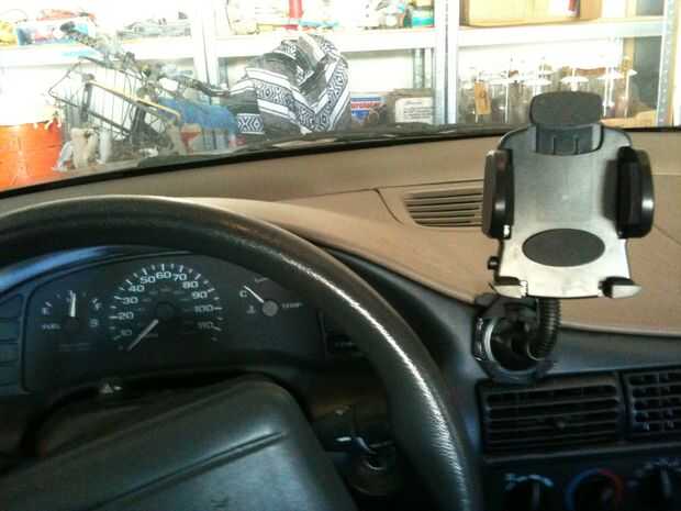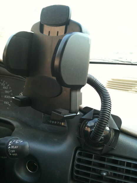 Un amigo mío se acercó con una solución bastante buena pegándose un montaje ventosa barato tipo teléfono para el vidrio frente a su tablero de instrumentos. Encontré un soporte de montaje ventosa parabrisas por unos dólares en línea. He pedido dos, uno para mi coche y otro para mi esposa. Por desgracia el vidrio en panel de instrumentos de mi esposa se curva para que la ventosa no se pudo obtener un sello y el único lugar que cabe en mi coche el odómetro y tendía a caerse de vez en cuando.