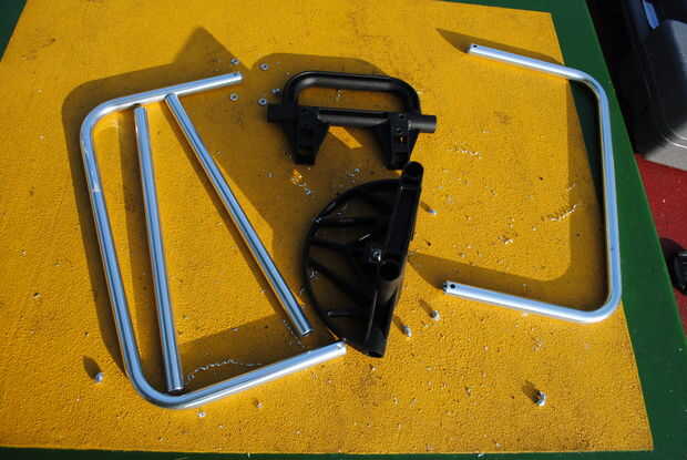 Tire de los postes de aluminio de los soportes de plástico. Están muy cómodos allí para que tenga un poco de tirón, pero asegúrese de que los remaches están totalmente hacia fuera!
